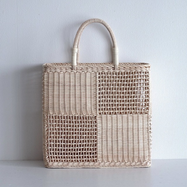 籐で編んだ手提げです。 透かし編みと素編みで大きな市松模様にしました。 編みたては白木色、少しずつ濃い色に変化します。 ☆デザインの細部は変わることがあります。 〈外形サイズ〉 幅 約30~31㎝ 高さ 約30㎝(持ち手含まず) マチ(底部) 約11㎝(底部内寸10㎝) ★何らかの形で「持ち手カバー」をお付けします。(簡易的なものになります。詳しくは「ブログ」ページをご参照ください。) ★全て受注製作です。「ブログ」のページに「ただいまの発送目安」リンクがあります。ウェブ版はページトップにも記載があります。詳しくはお問合せ欄などからお気軽にご質問ください。 ★籐かごについてのご注意 ・不揃いや色ムラ、個体差があります。 ・高温多湿状態でカビが発生する可能性があります。密封せず、湿気を避けてください。 ・型崩れが生じた場合は、霧吹きなどで湿らせてから形を整えてください。 ★お届け後、破損個所などはできる限り修理させていただきます。お問合せ欄などからご連絡ください。詳しくは「ショップ情報」に記載があります。 ★ご購入前に、「ショップ情報」をご一読いただきますようお願いいたします。