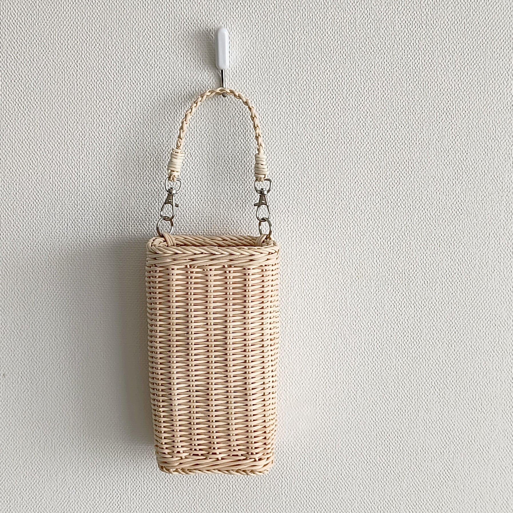 バッグのハンドルやベルトループに通して使える籐の持ち手と、ショルダーバッグとして使えるチェーン(120㎝鉄製ニッケルシルバー色メッキ)の2wayです。どちらも着脱可能です。